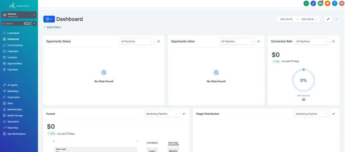 The Command Center is your real-time performance dashboard — the first thing you’ll see when you log into NUEWAVE. It gives you an instant snapshot of your business activity, helping you track leads, sales, conversations, and appointments all in one place. From here, you can view how many new leads have come in, how many opportunities are active, your pipeline value, your win rate, and the sources of your leads — whether they came from forms, funnels, chats, or campaigns. Each widget is interactive: click any stat to drill deeper into the details or jump directly into the corresponding tool. You can use date filters to analyze trends over time, compare performance week over week, and identify which channels or team members are driving results. It’s also where you’ll track revenue, conversion rates, and your overall marketing ROI — in real time. Whether you're reviewing a quick daily snapshot or making strategic decisions, the Command Center keeps you focused on what’s working and where to optimize.